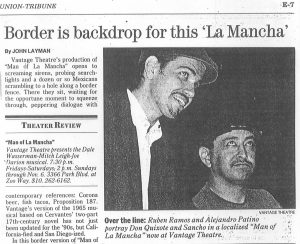 Man of La Mancha by Dale Wasserman. A multimedia updated version to reflect immigrant issues in California. Quixote is escaping Salinas governed Mexico, his coyote is Sancho. Together they bicycle across the border. Panels lined with immigrant stories, testimony of border patrol abuse and photos by Cordobe were on exhibit. Controversial film footage of border patrol abuse was provided by Collegio De Frontera Norte and was used in the production.