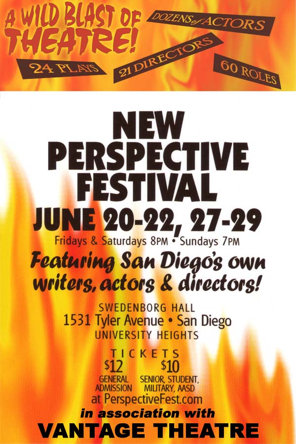 Twenty-four short plays by local playwrights, 18 directors, and over 60 actors. Each play performed twice in a six-night repertory in addition to three previews for a total of nine performances Vantage Theatre stepped in to fill the gap left by Actors Alliance to provide an opportunity for local theatre artists to continue an annual presentation of their work. Vantage Theatre, well known for its commitment to developing new works by local playwrights was the perfect partner for this Festival. The mission of Vantage to offer theatre from a “different vantage point” fit well with the New Perspective Festival’s motto: “change your view.”